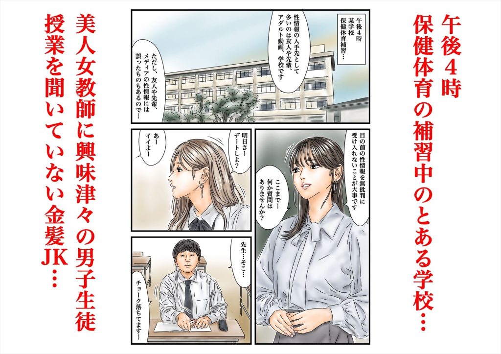 保健体育の補習中だった女教師と金髪のJK、男子生徒2人に対して
